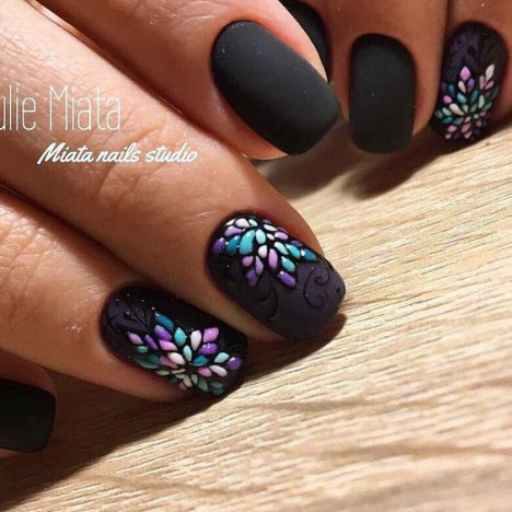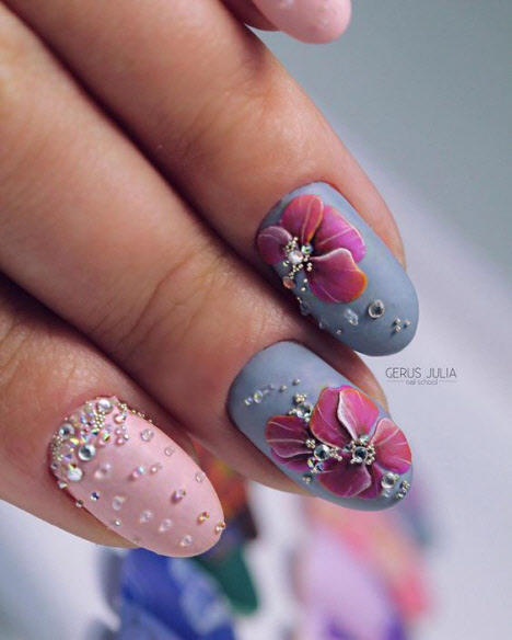 Für Liebhaber ungewöhnlicher Maniküre können Sie versuchen, ein volumetrisches Muster aufzutragen, dieses Design sieht sehr ungewöhnlich und gleichzeitig spektakulär aus. Die Blumen werden mit Acryl (Pulver) und einem speziellen Modellierpinsel geformt. Eine solche Maniküre sieht auf einem matten Finish am schönsten aus.