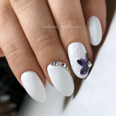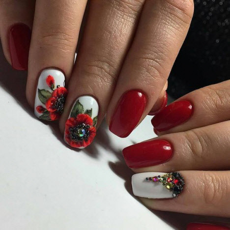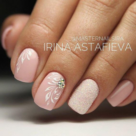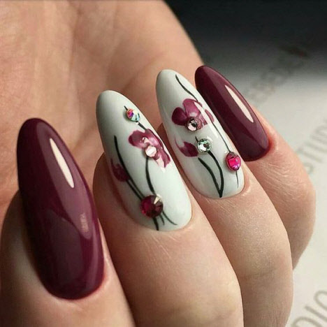 Wenn Sie Ihrer Maniküre nur ein paar Kieselsteine hinzufügen, werden Sie sofort sehen, wie sie in neuen Farben funkelt. Sie können die Mitte der Blume aus Strasssteinen machen oder den Blumenrand dekorieren, oder Sie können alle Blütenblätter mit kleinen Kieselsteinen dekorieren. Aber bei einer solchen Maniküre ist es die Hauptsache, es nicht mit Dekor zu übertreiben, sondern sich auf ein oder zwei Nägel zu konzentrieren. Achten Sie auch auf die Farbgebung, verwenden Sie nicht mehr als zwei Lackfarben für die Grundierung.
