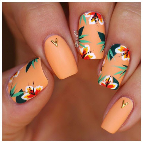 Modische Maniküre mit Blumen sieht sowohl auf kurzen Nägeln als auch auf mittellangen und natürlich langen Nägeln stilvoll aus.