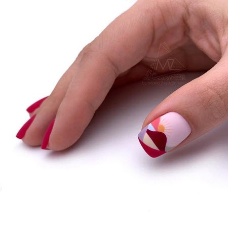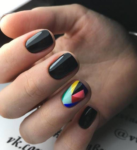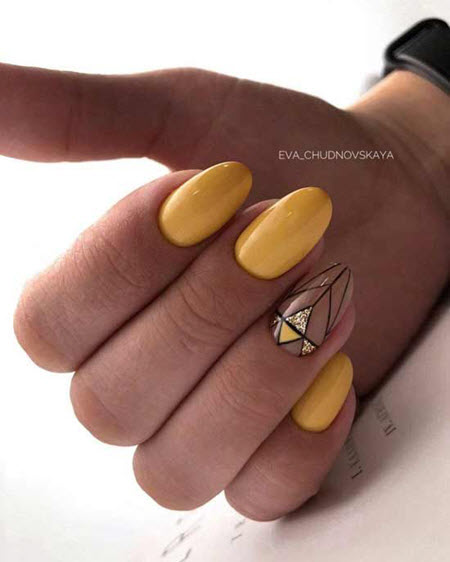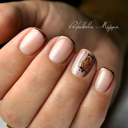 Klare Linien und geometrische Formen im Nageldesign verwandeln jede Maniküre, obwohl die Geometrie auf kurzen Nägeln am besten aussieht. Konzentrieren Sie sich auf nur einen Nagel und verwenden Sie helle und kontrastierende Farbtöne, und die Muster können sehr unterschiedlich sein. Die am häufigsten verwendeten geometrischen Formen sind Dreiecke, Quadrate, Rauten, Linien, Punkte.