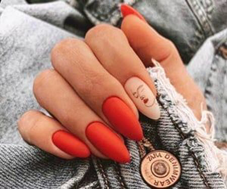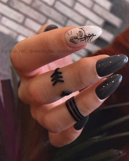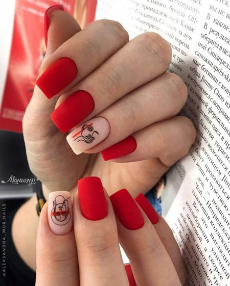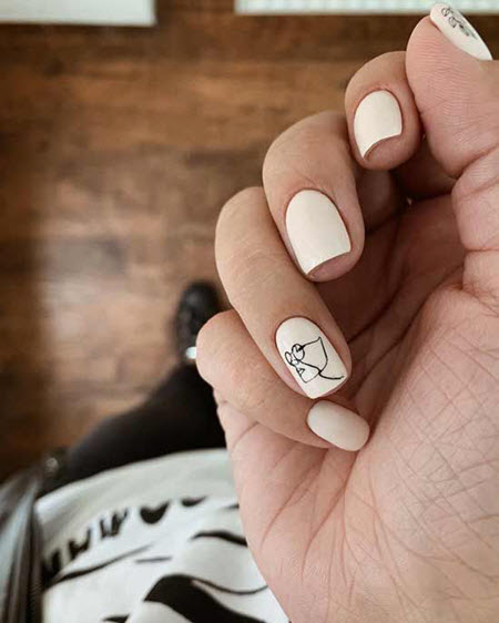 Damensilhouetten in der Maniküre sind sehr beliebt geworden, dieses Design wird am besten auf nur einen Nagel aufgetragen und konzentriert sich auf den Kontrast zwischen der Farbe des Lacks und dem Muster selbst. Dieses Design sieht auf einer matten Basis sehr schön aus.