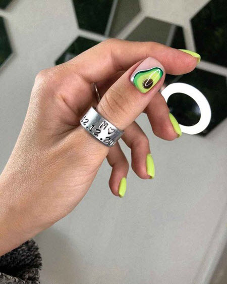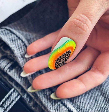 Das Bild von Früchten in der Maniküre ist in den letzten Jahren sehr beliebt geworden. Orangen, Kiwi, Zitronen, Erdbeeren, Feigen, Avocados und viele andere Früchte sind auf den Nägeln von Mädchen zu sehen. Das auffällige Design lenkt die Aufmerksamkeit auf Ihre Hände.