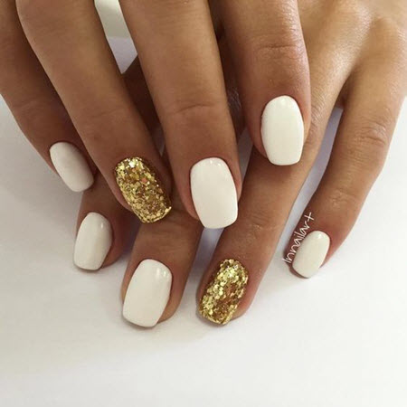 Wunderschöne goldene Pailletten werden mit allen Lacktönen kombiniert und auf dem Foto mit Weiß kombiniert, was diese Maniküre makellos macht.