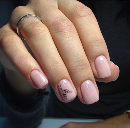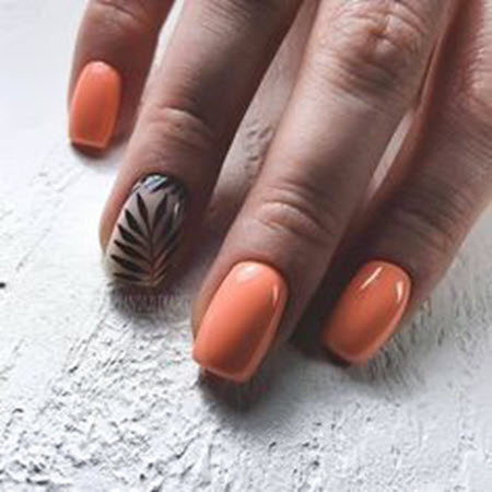 Viele Mädchen verliebten sich in das Design einer Maniküre mit Zweigen und Blättern, die mit vielen Lackfarben schön geschlagen und zu jeder Jahreszeit gemacht werden kann. Auf dem Foto befindet sich ein trendiger Orangenlack, der als Grundlage genommen wird, und am Ringfinger ist eine Nude-Farbe mit einem Astmuster kontrastiert.