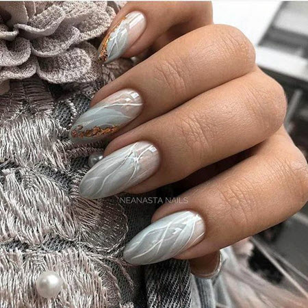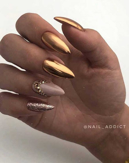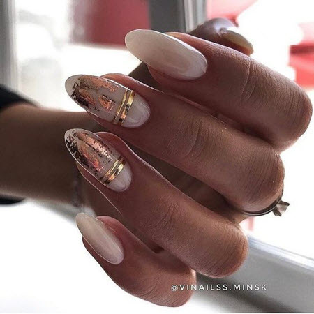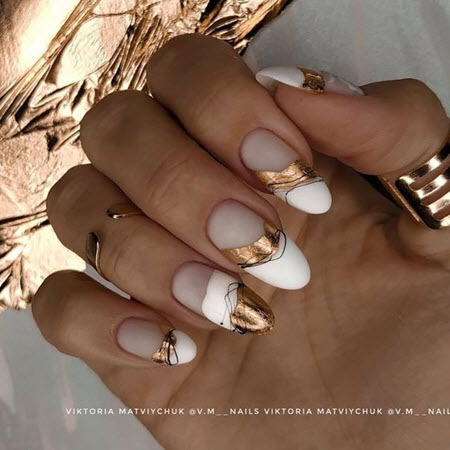 In dieser Saison empfehlen Stylisten und Nailart-Meister, ovale oder mandelförmige Nägel zu wählen und nicht zu lange Nägel zu bevorzugen. Das Design kann sehr vielfältig sein, von Minimalismus und Geometrie bis hin zu Funkeln und Steinen. Nageldesign mit Gold sieht auf langen Nägeln wunderschön aus, es kann eine Maniküre mit Folie, Funkeln, Steinen, Reiben sein.