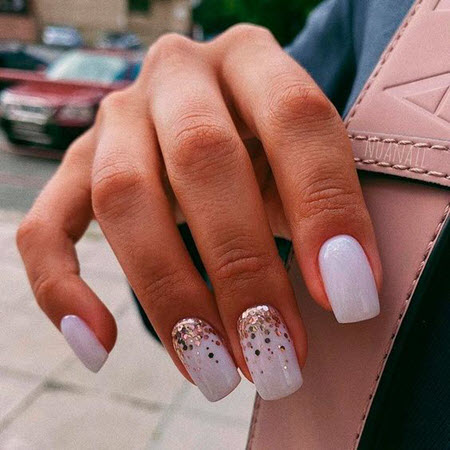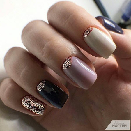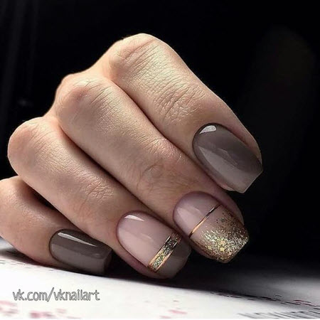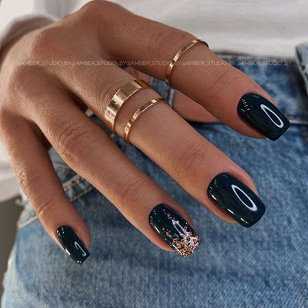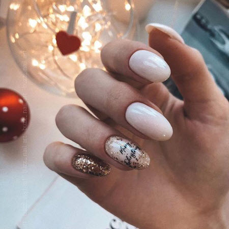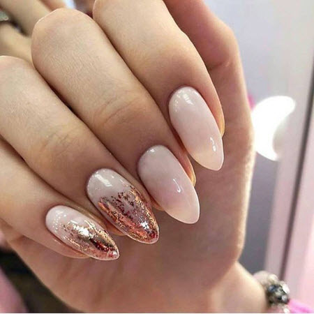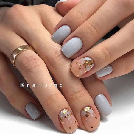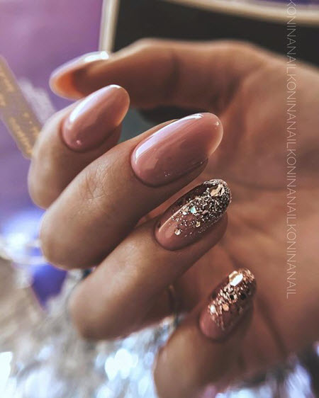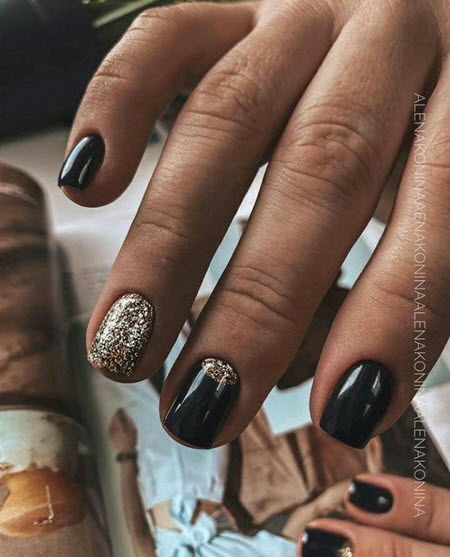 Goldpailletten werden mit allen Lacktönen kombiniert, dies ist die perfekte Designoption für die kürzesten Nägel. Um die Maniküre nicht zu überladen, tragen Sie Glitzer in Form eines Akzents auf ein oder zwei Nägel auf.