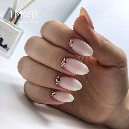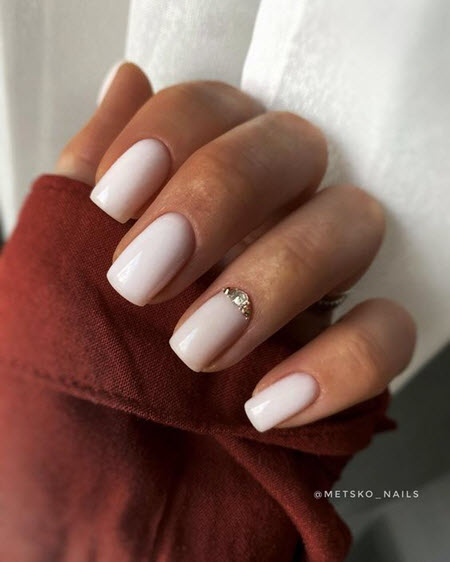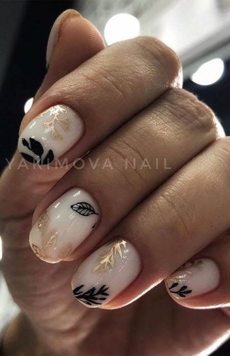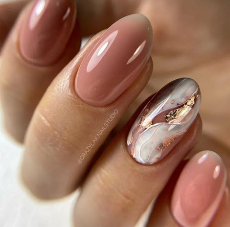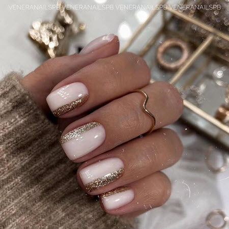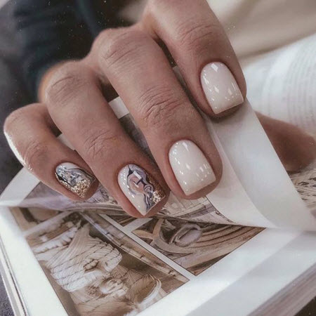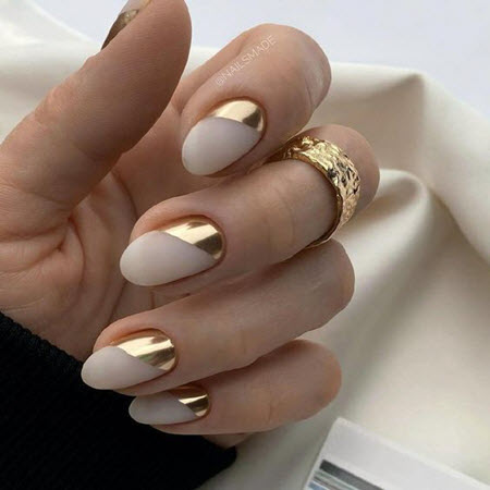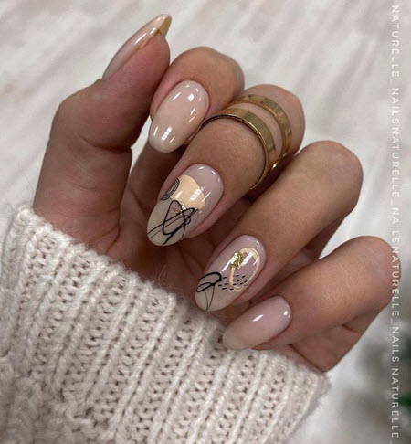 Die beste Kulisse für Goldschmuck ist nackt, und dieses Duo wird 2024-2025 auf dem Höhepunkt der Popularität sein. Gold passt gut zu Beige, Karamell, Perle, Pfirsich, Weiß und Hellrosa. Vor diesem Hintergrund leuchten die goldenen Designelemente sehr schön und lenken die Aufmerksamkeit auf Ihre Maniküre.