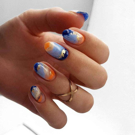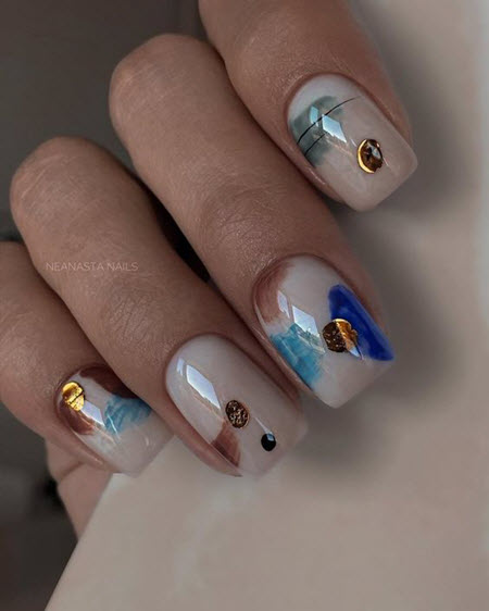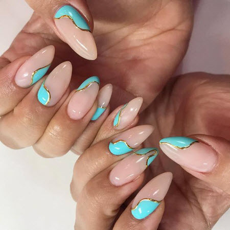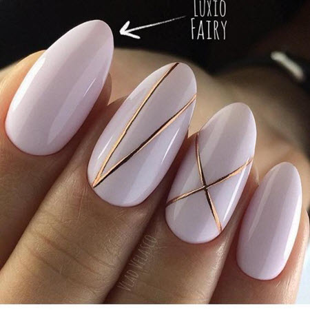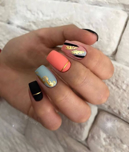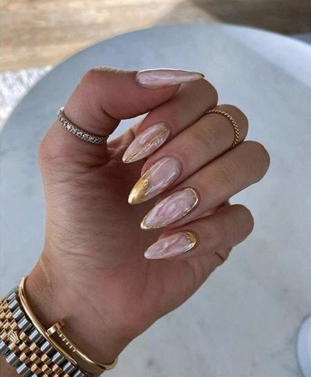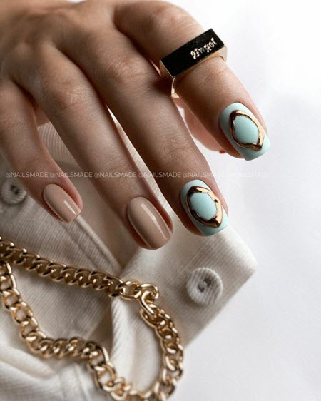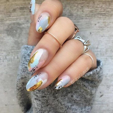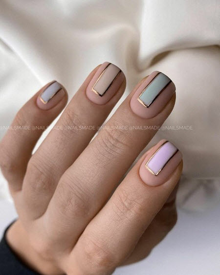 Wenn Sie eine kreative Seele sind und dies mit Ihren trendigen Nageldesigns unterstreichen möchten, ist eine Goldmaniküre praktisch. Diese Kombination aus Pastellfarben und goldenem Nagellack wird zu jeder Jahreszeit relevant sein.