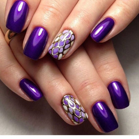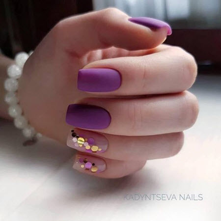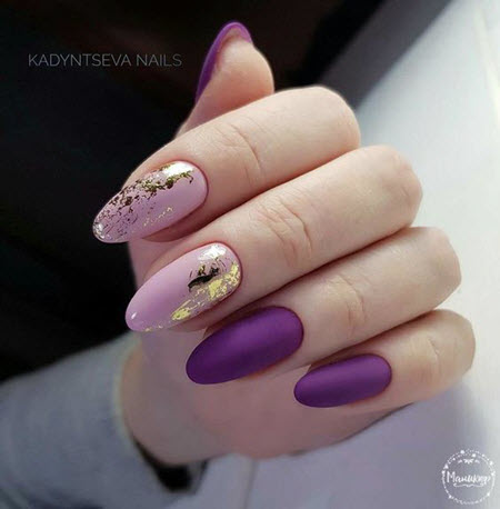 - Spektakuläres Lila harmoniert perfekt mit goldenen Details auf den Nägeln.