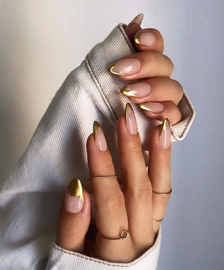 Ein französischer Mantel mit Goldspitze anstelle des üblichen Weiß sieht fantastisch aus, perfekt, wenn Sie nach etwas Luxuriösem suchen, und dies ist der unbestrittene Nail-Art-Trend für die Saison 2024-2025. French Manicure sieht unglaublich schön aus, wo die Lächelnlinie mit einem goldenen Glanz gefüllt ist. Stilvolle und modische Optionen für French Manicure mit Gold, siehe Foto: