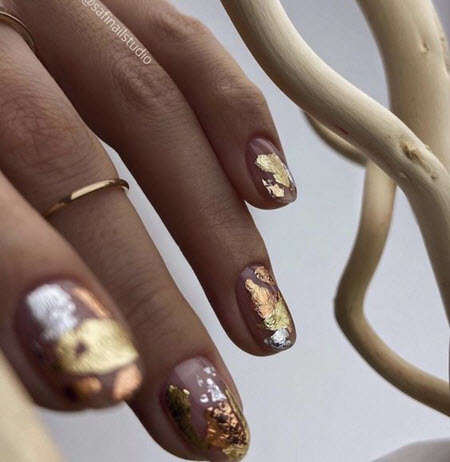 Folie ist das beliebteste Material für das Nageldesign. Dank ihr kreieren Maniküristen unglaubliche Muster, die fantastisch aussehen. Goldfolie ist am vielseitigsten, sie kann mit allen Lacktönen kombiniert werden, eignet sich für die festliche und alltägliche Maniküre, während sie leicht mit Folie zu verarbeiten ist.