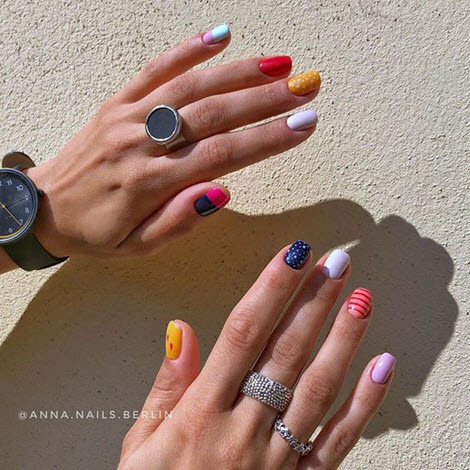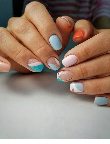 Eine neue Frühlingsmaniküre für kurze Nägel kann elegant und feminin, trotzig und erstaunlich gemacht werden. Entdecken Sie interessante Maniküre-Ideen in Pastellfarben, mit mehrfarbigen Dekoren und Dekorationen, in modischen Techniken und Stilen sowie in den aktuellen Frühlingsfarben der Lacke: Blau, Pink, Blau, Türkis, Orange, Gelb.