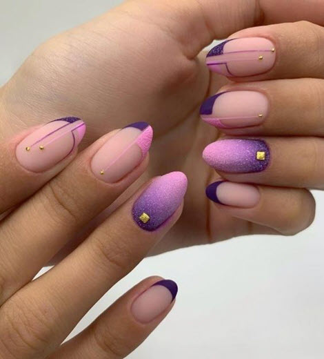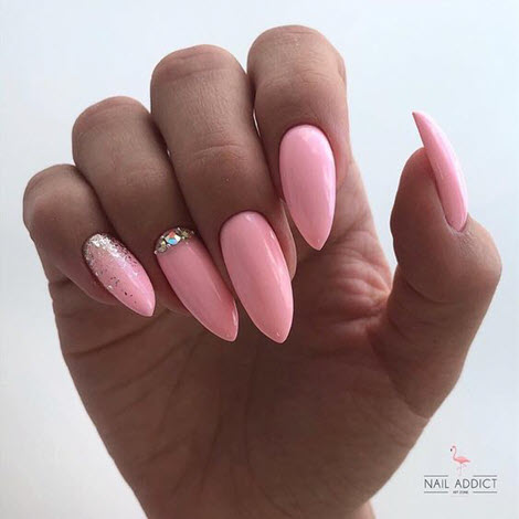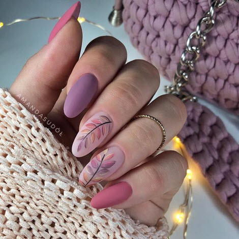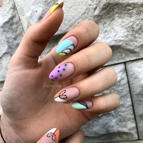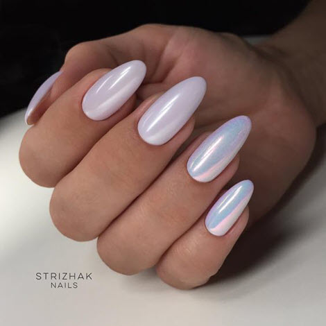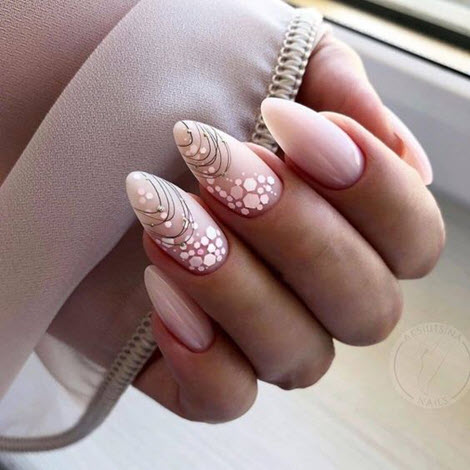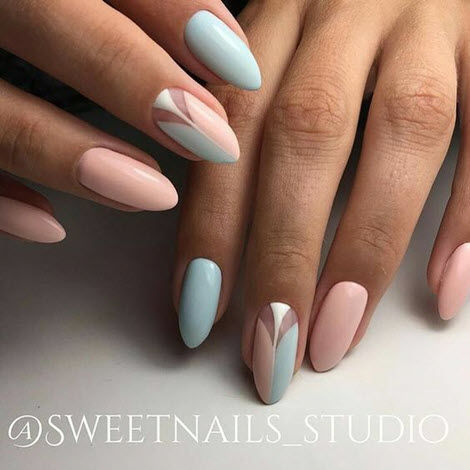 Die unbestritten trendige Nagelform für lange und mittlere Nägel ist eine ovale, mandelförmige Form, mit der jede Maniküre wunderschön aussieht. Die Mandelform der Nägel verlängert optisch die Finger und macht die Hände anmutiger. Was das Design angeht, können Sie hier im Allgemeinen durchstreifen, jeder von ihnen wird mit dieser Form von Nägeln kombiniert: schöne Zeichnungen, Muster, Inschriften, Linien, Streifen und andere Elemente der Geometrie sowie die beliebtesten Funkeln, Steine und andere Einrichtung.