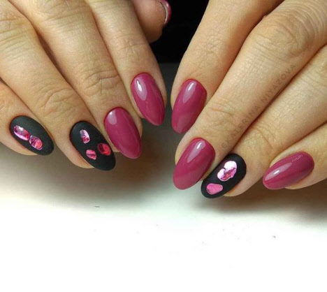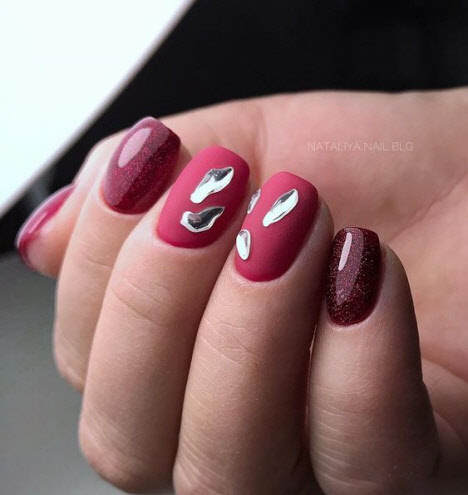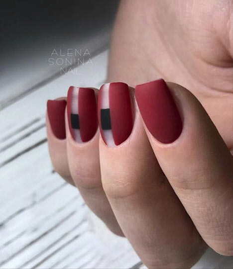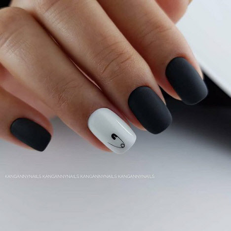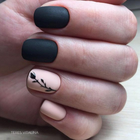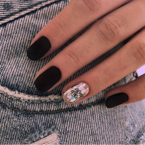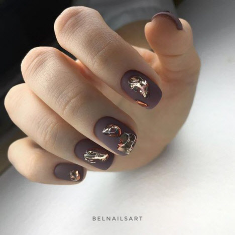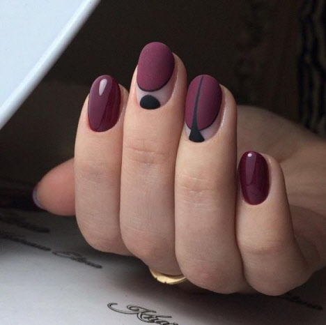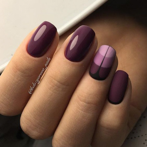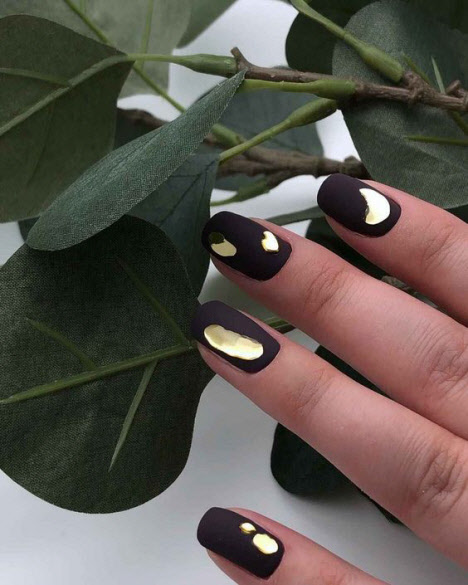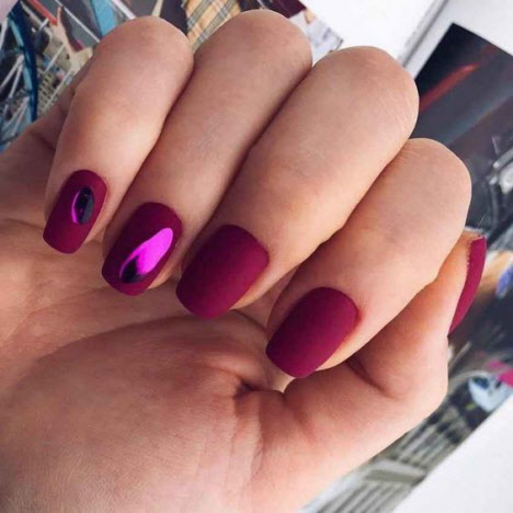 Die dunkle Farbe kombiniert mit einem matten Top auf kurzen Nägeln sieht schick aus und hat eine Reihe weiblicher Fans. Für eine solche Maniküre können Sie sicher jede Textur oder jedes Dekor auswählen und es sowohl mit alltäglichen als auch mit feierlichen Designs kombinieren.