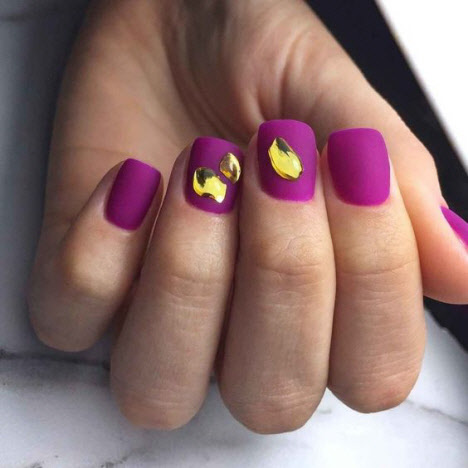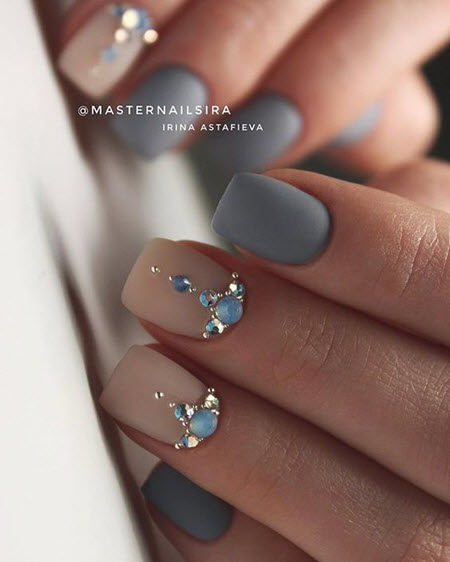Matte Maniküre für kurze Nägel mit Funkeln und Steinen