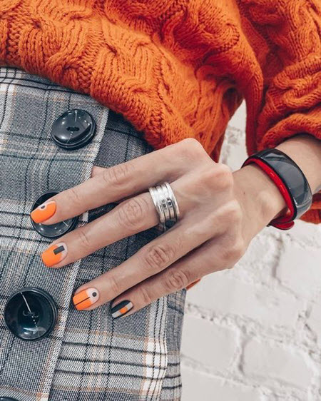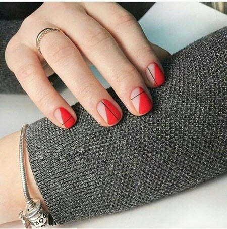Es sind geometrische Muster, die kurze Nägel am erfolgreichsten und saubersten schmücken und ihnen Charme und Eleganz verleihen. Dieses Design kann wie kein anderes die Schönheit und Attraktivität kurzer Nägel hervorheben. Was das Farbschema betrifft, können Sie sicher alle Schattierungen verwenden, die dem ausgewählten Bild entsprechen.