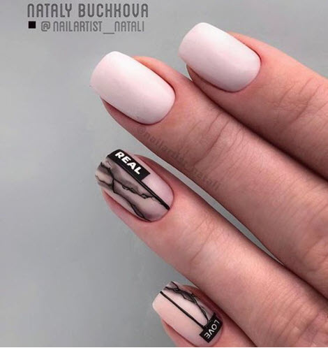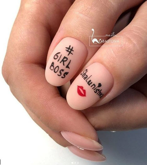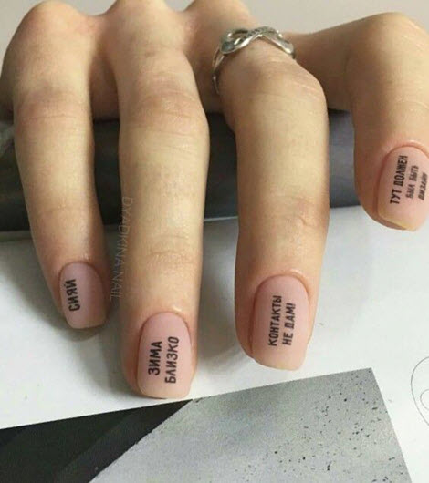 Die beliebtesten Wörter sind „Liebe“, „Engel“, „süß“, „Liebe“, „Seele“, „glücklich“, „Liebe“, „Oh, alles“ und viele andere. Es ist besser, die Inschriften auf einer monochromatischen Beschichtung zu machen, alle nackten, hellen Farbtöne sind eine hervorragende Grundlage für eine solche Maniküre. Der Schriftzug selbst kann romantisch und raffiniert oder gewagt und trotzig sein.