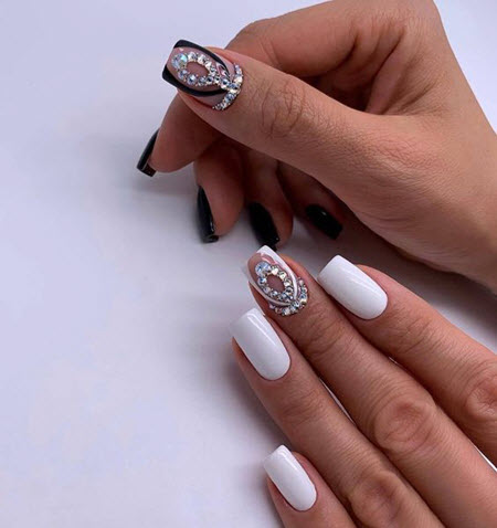 Die modische Maniküre mit Strasssteinen im Jahr 2024 kann sowohl auf kurzen als auch auf langen Nägeln getragen werden.