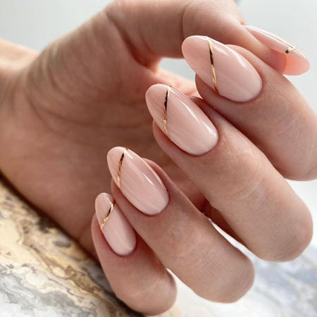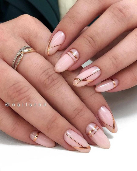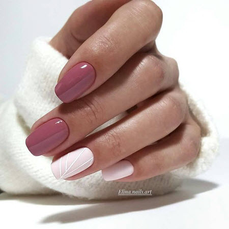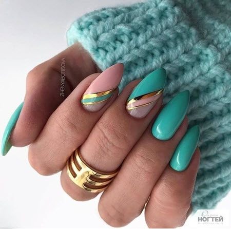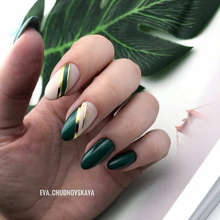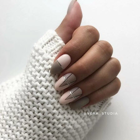 Die Streifen bei einer solchen Maniküre können sowohl vertikal als auch horizontal sein. Eine Maniküre mit diagonalen Streifen auf dem Nagel wird nicht weniger schön. Das geometrische Muster mit Streifen sieht sehr originell aus und Streifen können auch mit Glitzern oder Kieselsteinen kombiniert werden. Eine Maniküre mit Streifen und Linien sieht in einem matten Finish besonders schön aus.