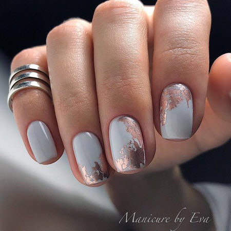 Gold, Silber und mehrfarbige Folien liegen in dieser Saison im Trend, in unterschiedlichen Techniken, sei es als einfarbige Beschichtung oder als kombiniertes Design (Abstraktion, Zeichnung, Minimalismus, Beschriftung, Kieselsteine).