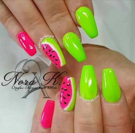 Die Sommermaniküre wird oft mit verschiedenen Früchten und Beeren dekoriert. Designs mit einem Muster aus Kirschen, Himbeeren, Erdbeeren, Ananas und natürlich einer Wassermelone sehen auf einem einfarbigen Joghurtlack sehr stylisch aus.