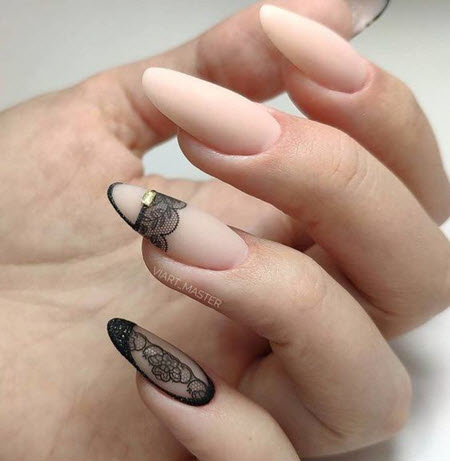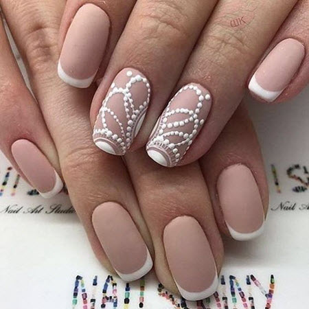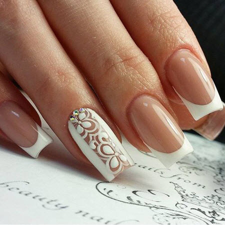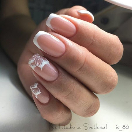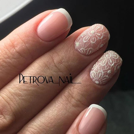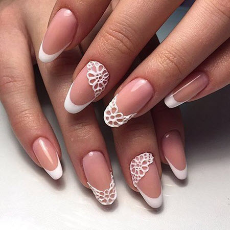 Eine Spitzenmaniküre in Kombination mit einer Jacke sieht sehr schön und elegant aus. Diese Art der French Manicure wird oft für die Hochzeitsmaniküre gewählt.