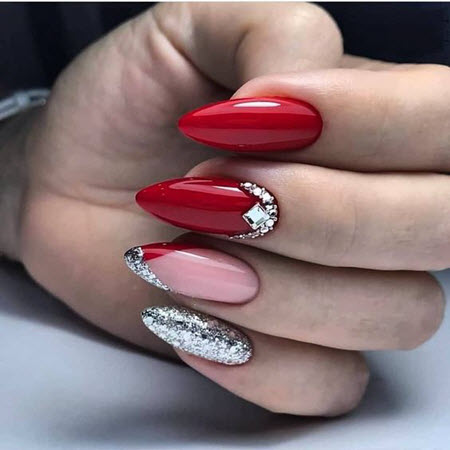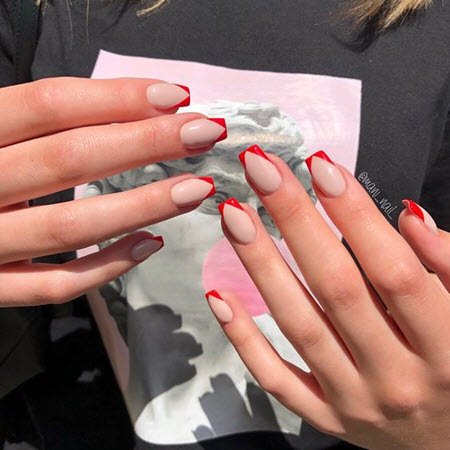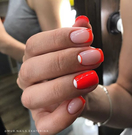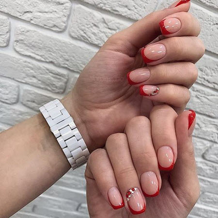 Es sieht unglaublich stylisch aus und verleiht jedem Look eine besondere Eleganz. Eine so auffällige French Manicure kann durch Designs in Form von Abstraktion, Spitze, Geometrie oder floralen Designs ergänzt werden. Jeder von ihnen schmückt die rote Jacke auf seine Weise. Zusätzliches Dekor ist in diesem Fall ebenfalls angebracht, aber auch ohne Verzierungen sieht die rote Jacke toll aus.