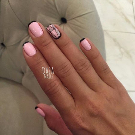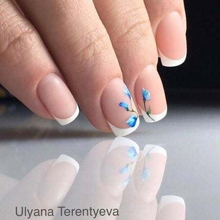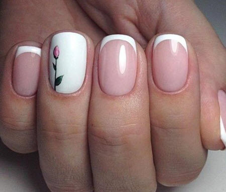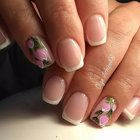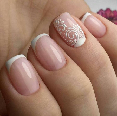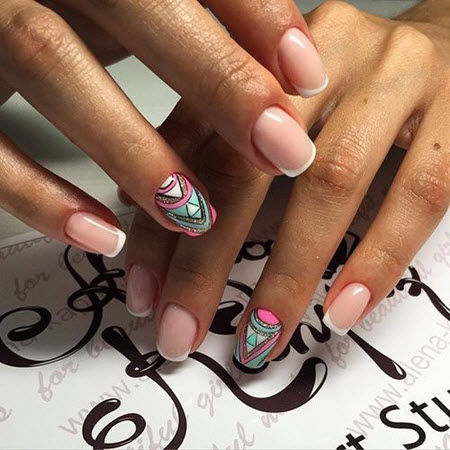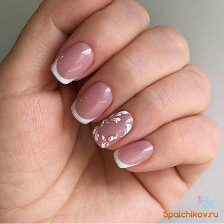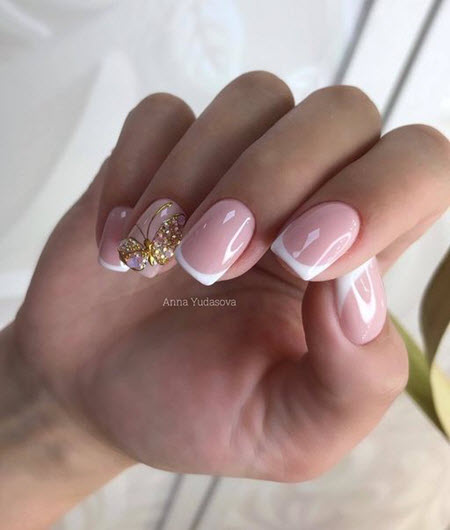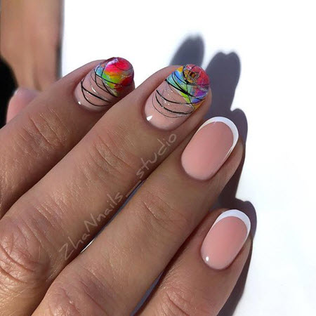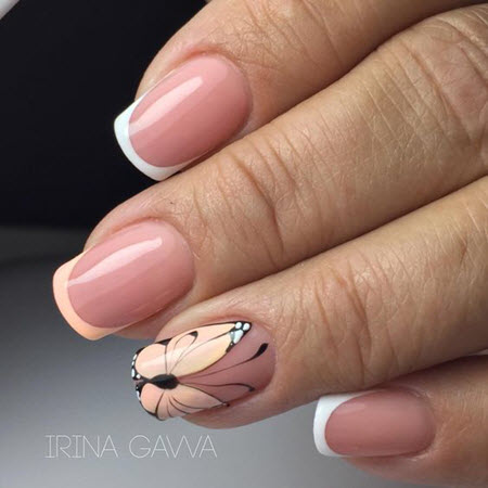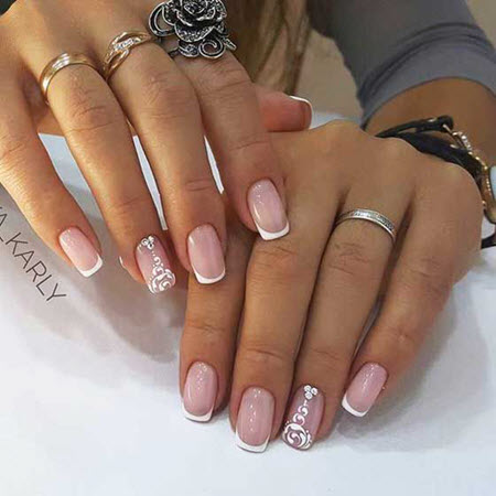 Die Linie eines Lächelns in einer Jacke sollte sehr subtil und sauber gezeichnet werden, so dass dies fast ein Schmuckwerk des Meisters ist, in dem sich seine Professionalität manifestiert. French Manicure auf kurzen Nägeln kann mit Designs in jedem Stil ergänzt werden.