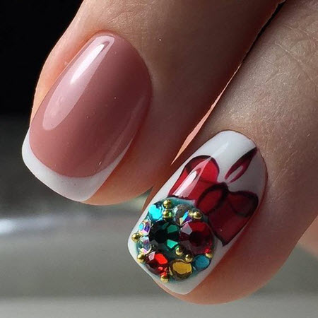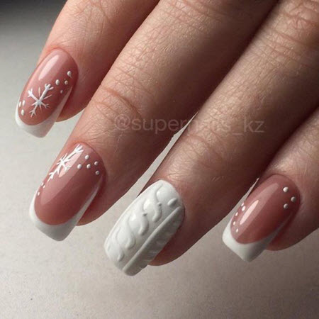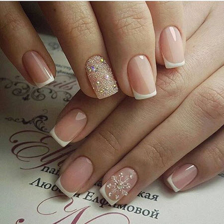 Im Winter kann eine Jacke mit Schneeflocken, Weihnachtsschmuck und sogar Neujahrshelden dekoriert werden. Und für Liebhaber klassischerer Optionen können Sie die French Manicure mit reichen Funkeln und Kieselsteinen dekorieren.