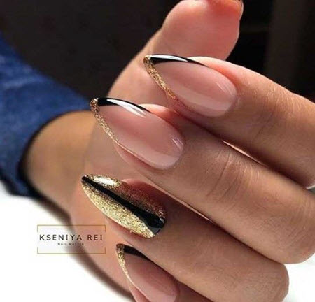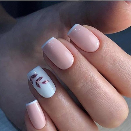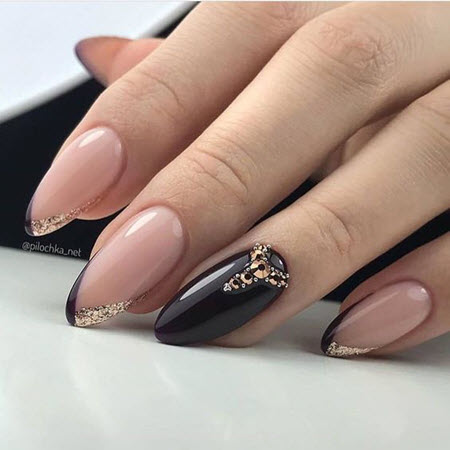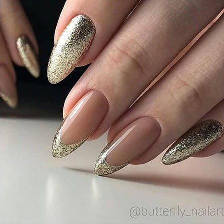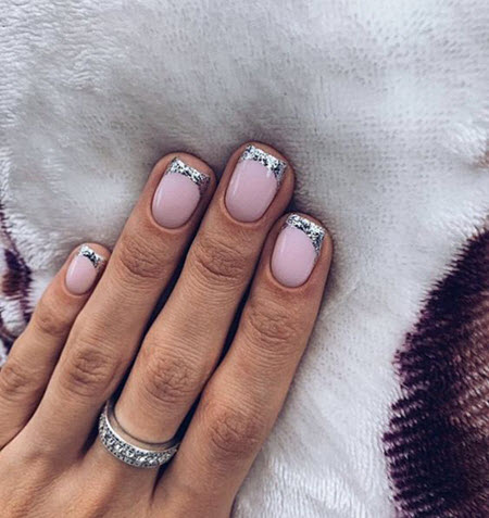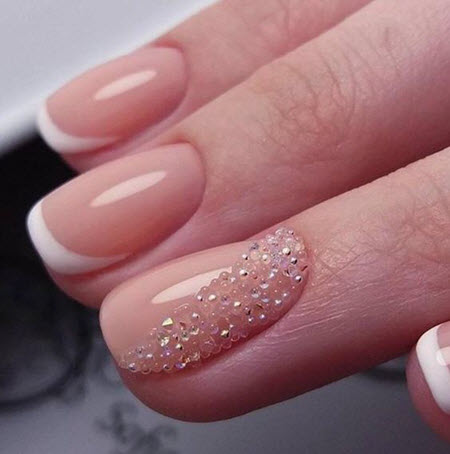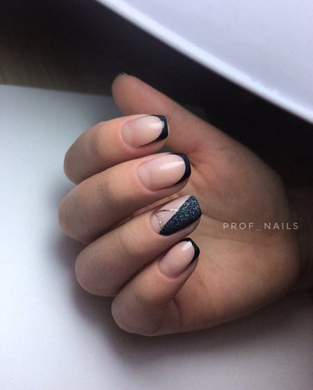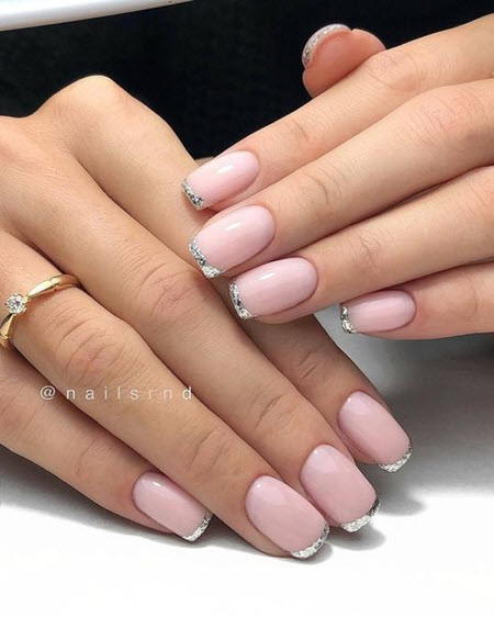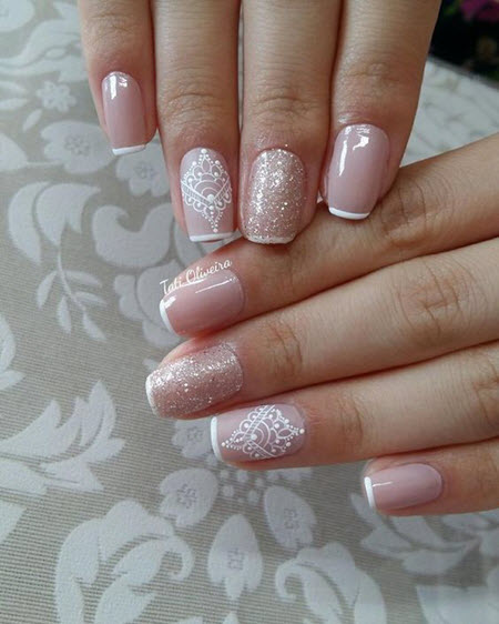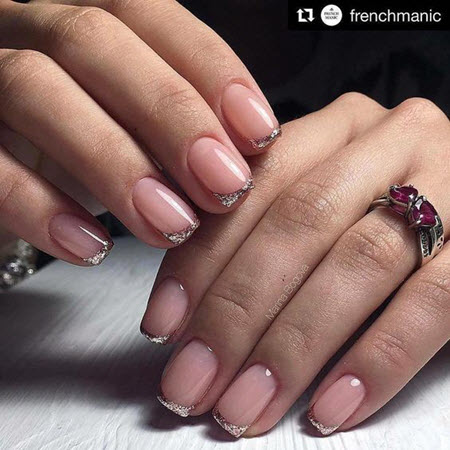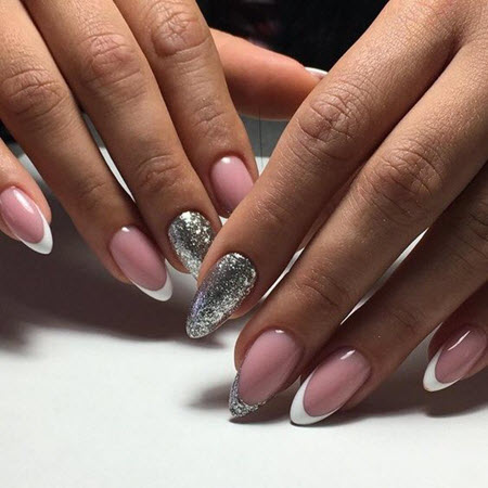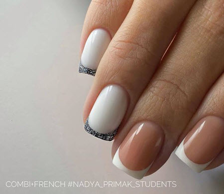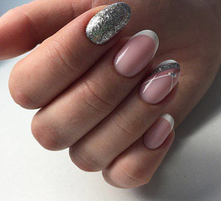 Oft ist die Spitze der Nagelplatte oder der Basalbereich mit Glitzern verziert, wodurch ein Akzent in der Maniküre erzielt wird. Dies geschieht meist an nur wenigen Nägeln. Diese Option ist perfekt für jeden Anlass, da sie nicht zu hell ist und zart aussieht.Außerdem verwenden viele Maniküristen Glitzer nur als Akzent, sie schmücken nämlich Zeichnungen. Das heißt, French Manicure wird zunächst mit Monogrammen, geometrischen Mustern und Spitzeneinsätzen kombiniert, wenn alles fertig ist, kann das Design mit Funkeln betont werden. Das Ergebnis ist eine luxuriöse, voluminöse Maniküre mit schimmernden Details. Es eignet sich für jeden Anlass und ist daher in den Jahren 2024-2025 besonders relevant.