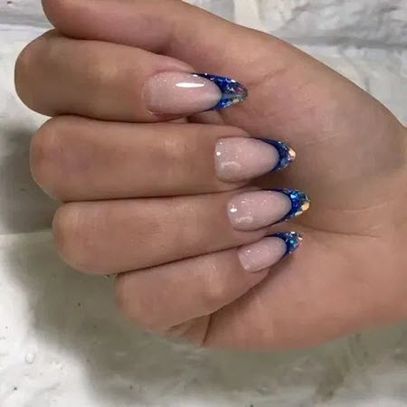 Die blaue Jacke sieht sowohl auf kurzen als auch auf langen Nägeln toll aus. Die aktuelle blaue Farbe des Jahres 2024 wird elegant mit Steinen und Funkeln kombiniert, Ideen finden Sie auf dem Foto unten: