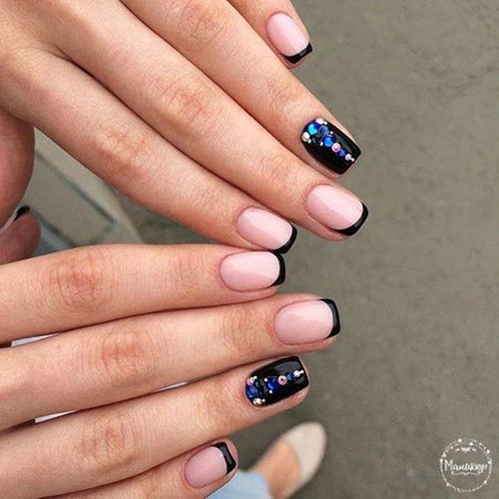In den Jahren 2024-2025 schlagen Nagelkünstler vor, ein regelmäßiges Design in anderen Farbtönen zu erstellen. In Schwarz sieht die French Manicure zum Beispiel unglaublich schön, stylisch und sogar ein wenig gewagt aus. Gleiches gilt für die Maniküre in dunklen Blau-, Rot-, Grün- und Violetttönen. Jeder von ihnen sieht auf seine Weise interessant aus.