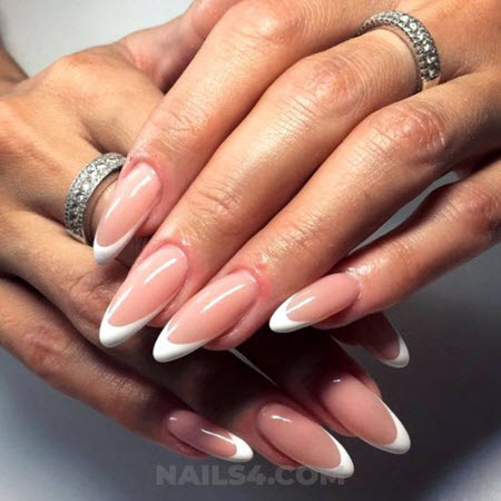 Auf langen Nägeln sieht die Jacke sehr stylisch und beeindruckend aus. Unabhängig von der Form des Nagels hat die French Manicure ein elegantes Aussehen und die Form kann mandelförmig, oval, eckig und scharf sein.