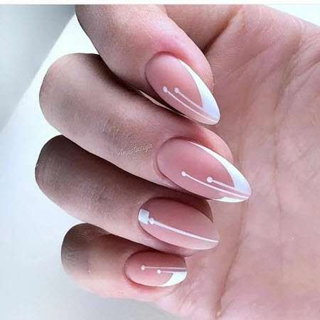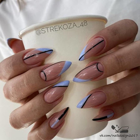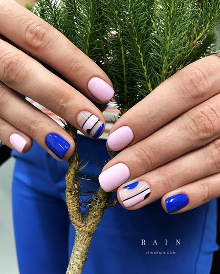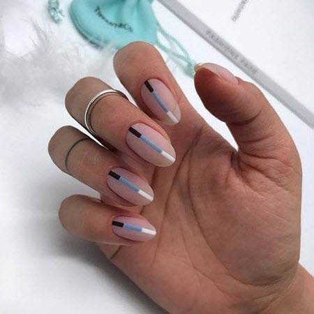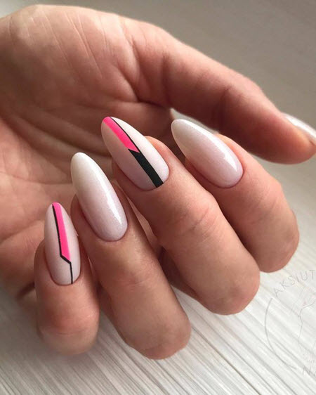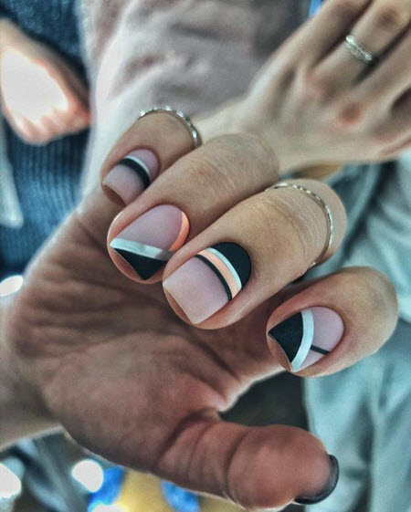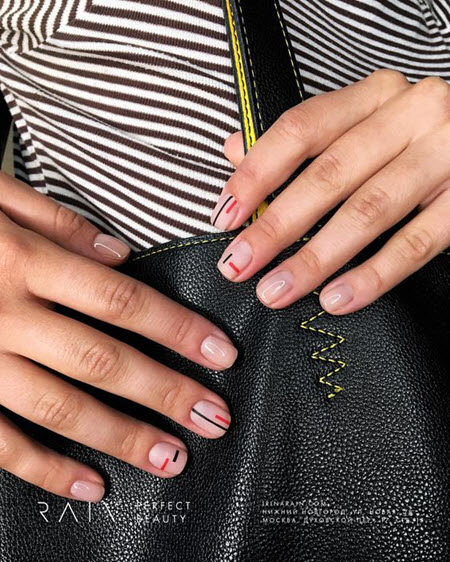 Streifen, Zickzack, Punkte und Striche können manchmal Wunder wirken, besonders wenn sie mit Elementen des negativen Raums kombiniert werden. Maniküre-Negativraum ist, wenn unlackierte Bereiche auf der Nagelplatte verbleiben, sie mit transparentem Lack oder Lack bedeckt sind, der hautfarben ist. Bei einer solchen Maniküre müssen klare Konturen und Grenzen zwischen farbigem und transparentem Teil beachtet werden.