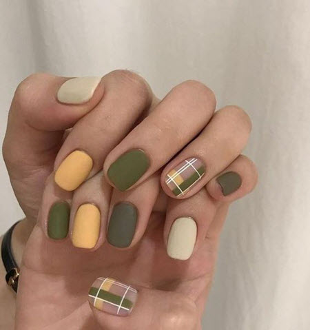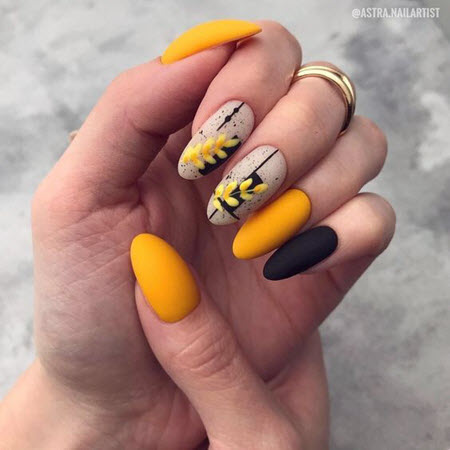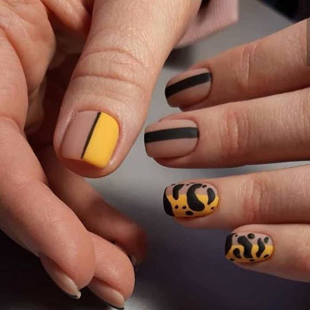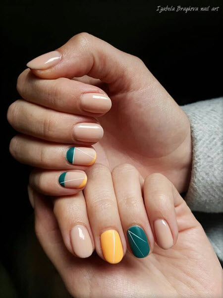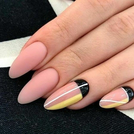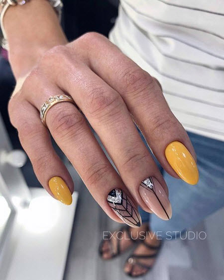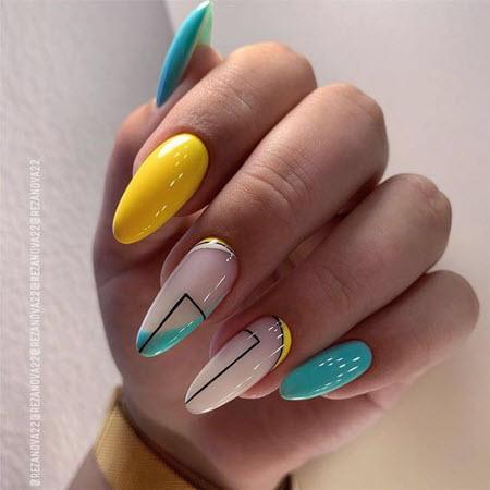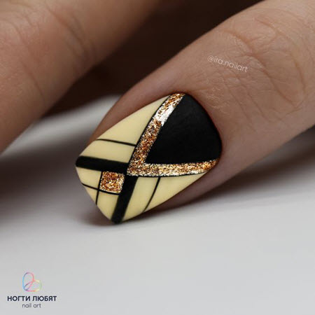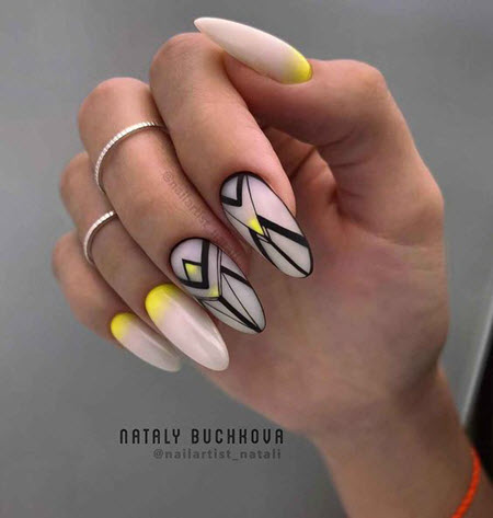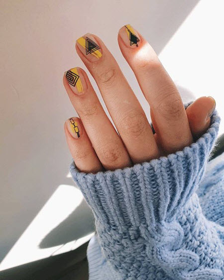 Schöne Gelbtöne von Lacken werden sehr stilvoll mit Geometriedesign kombiniert. Besonders schön sieht die Kombination einer gelben Basis mit einer nudefarbenen Basis aus, auf die ein geometrisches Muster aufgetragen ist.