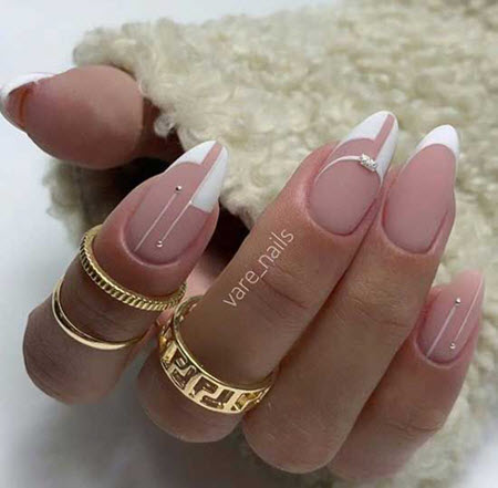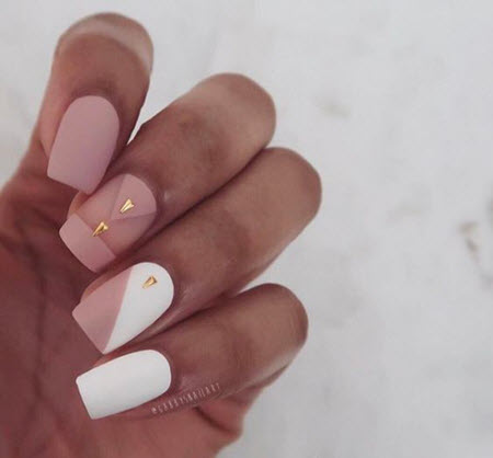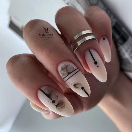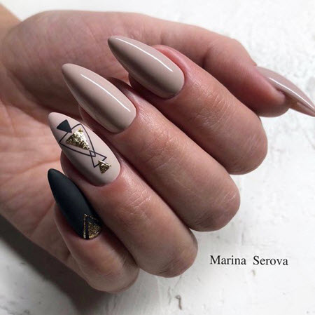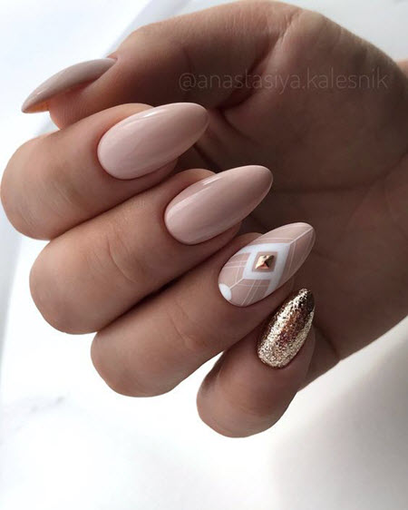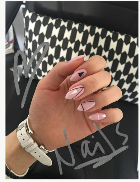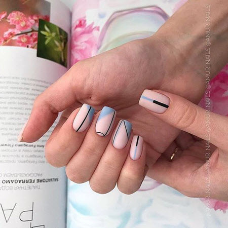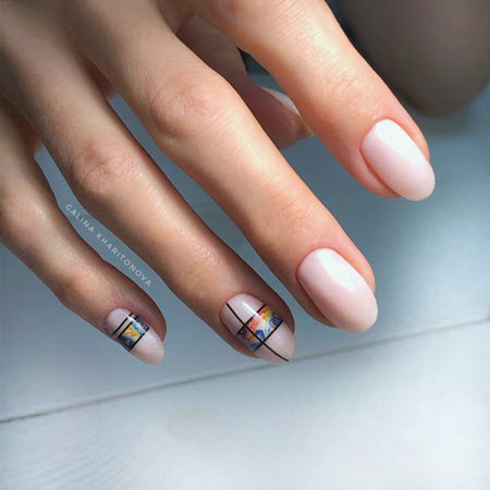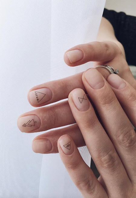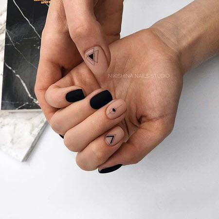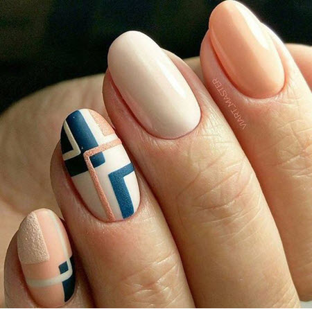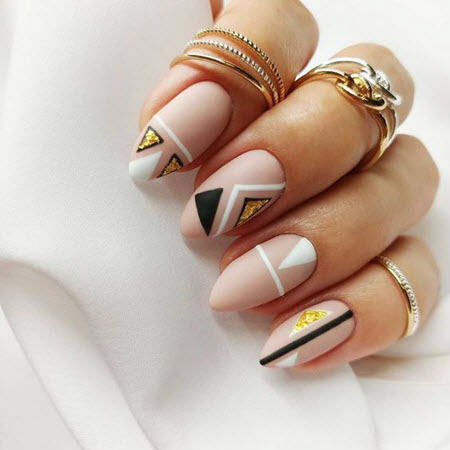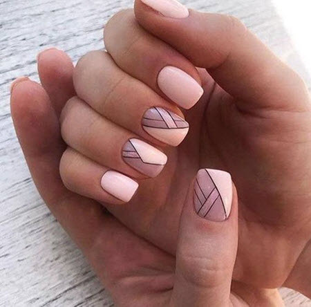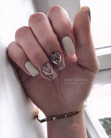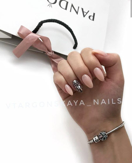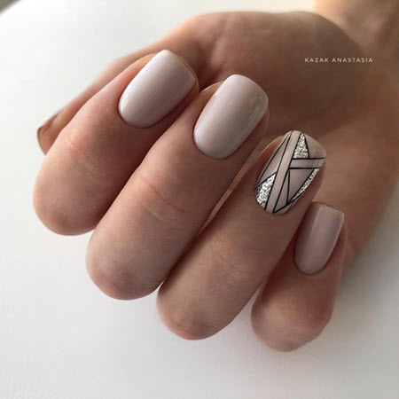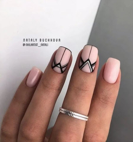 Nude Nail Art im Stil der Geometrie ist eine ideale Leinwand für Zeichnungen und Muster, da auf dieser Basis der Kontrast der Schattierungen am besten zu sehen ist.