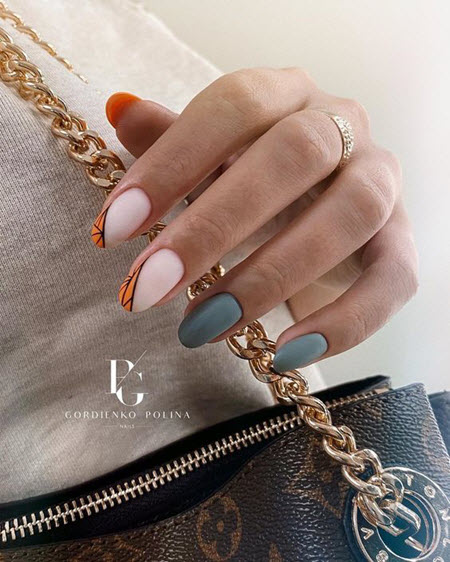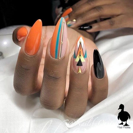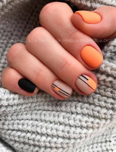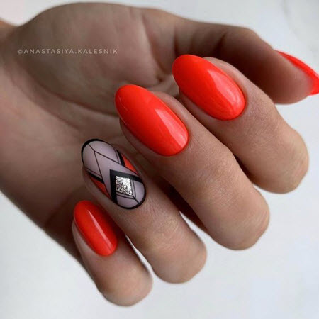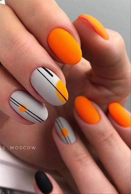 Die orange Farbe des Lacks ist eine der Haupttöne des Jahres 2024, diese Farbe kann hell und gedämpft sein. Geometriedesign sieht in Kombination mit oranger Farbe sehr schön aus. Linien, Streifen und geometrische Formen können auf ein oder zwei Nägel aufgetragen werden, um die orange Farbe zu betonen und zu verdünnen.