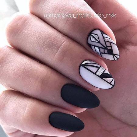 Schwarze geometrische Nageldesigns passen perfekt zu Ihrem Abendkleid oder stylischen Badeanzug, denn Schwarz ist universell.