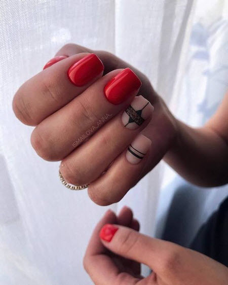 Die rote Farbe der Maniküre ist ein Klassiker, der immer im Trend bleiben wird; im Jahr 2024 ergänzen Sie die rote Maniküre mit einem modischen geometrischen Muster. Rottöne passen gut zu Weiß, Schwarz, Beige Lack.
