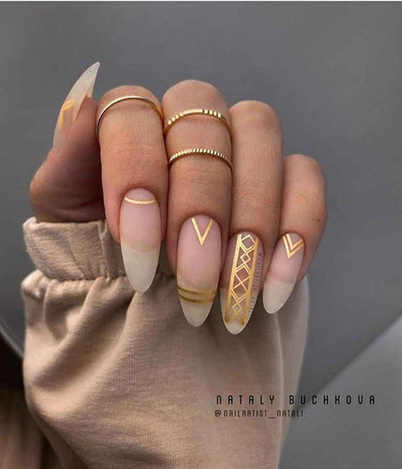 Geometrische Designs auf ovalen und Mandelnägeln können so komplex oder einfach sein, wie es Ihre Vorstellungskraft zulässt. Modische Zeichnungen im Stil der Geometrie 2024 finden Sie auf dem Foto unten: