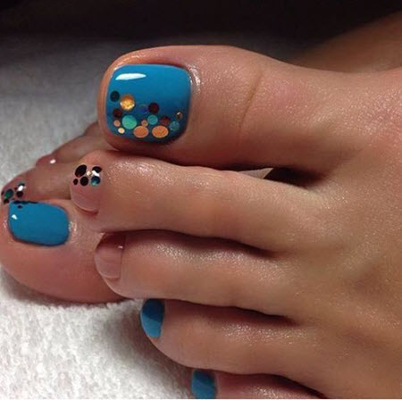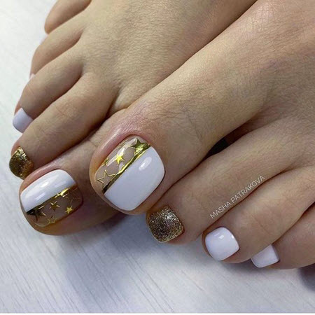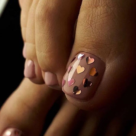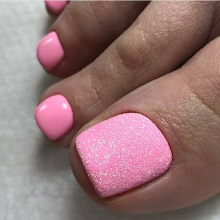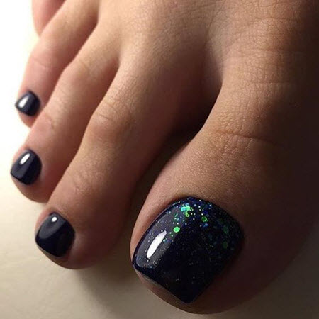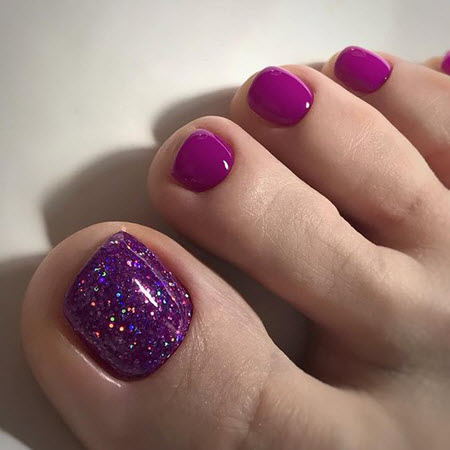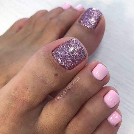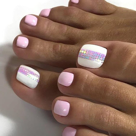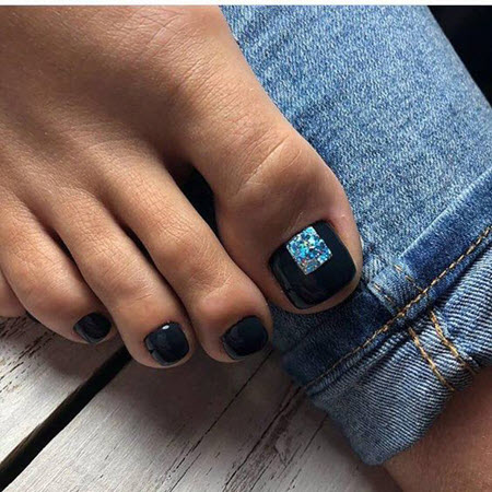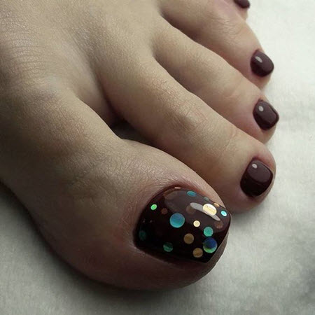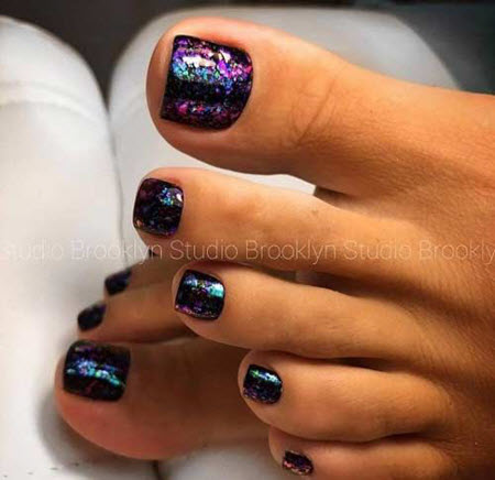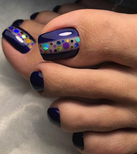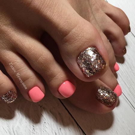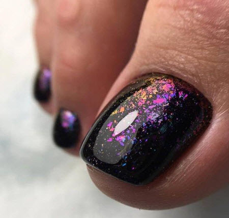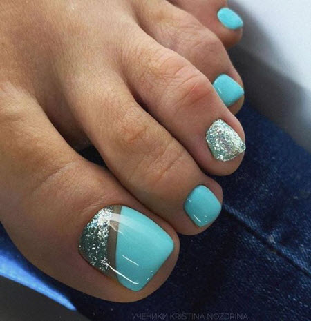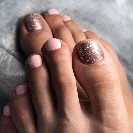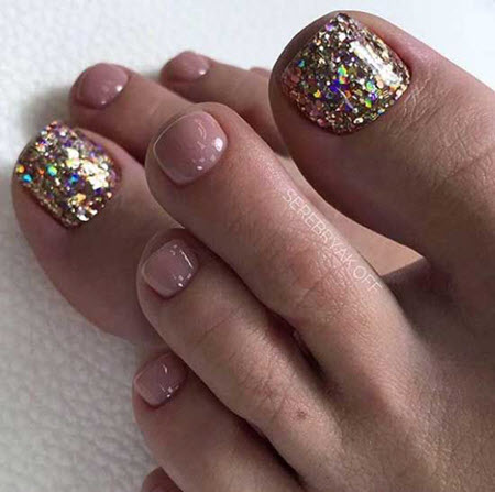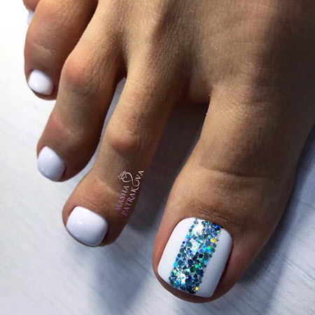 Pailletten ergänzen perfekt eine Pediküre in dunklen und hellen Farben. Um ein schönes Nageldesign zu erzielen, fügen Sie Ihrer Pediküre einfach ein wenig Glanz hinzu, konzentrieren Sie sich beispielsweise auf einen oder zwei Nägel. Es gibt verschiedene Arten von Glitzer, meistens werden sie mit einem speziellen Reiben, Pinsel oder von Hand auf die Nägel aufgetragen.