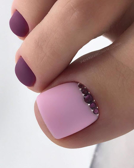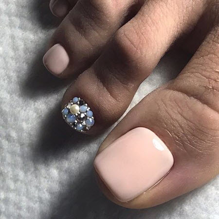 Modische Pediküre mit Steinen für die Saison 2024 erfordert ein lakonisches und minimalistisches Design, sie sollte ohne Schnickschnack und vorzugsweise auf einem matten Untergrund durchgeführt werden, damit Steine und Strasssteine spektakulärer aussehen. Tragen Sie den Akzent in Form von Steinen auf einen Finger auf.