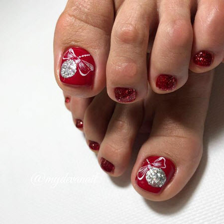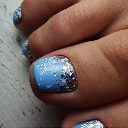 Ideen für die Wintermaniküre sind ohne Neujahrsdesigns und Drucke kaum vorstellbar. Auch im Winter können Sie Glitzer und viel Glitzer für eine Pediküre verwenden.