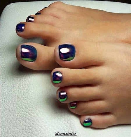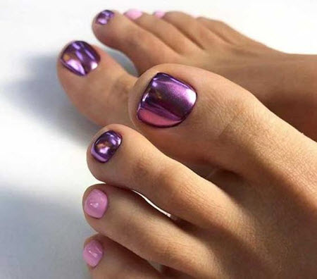 Die geriebene Pediküre sieht dank ihres Glanzes und Glanzes wunderschön aus. Wenn Sie die Nägel reiben, ist kein zusätzliches Dekor mehr erforderlich, da eine solche Maniküre bereits an sich autark aussieht.