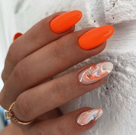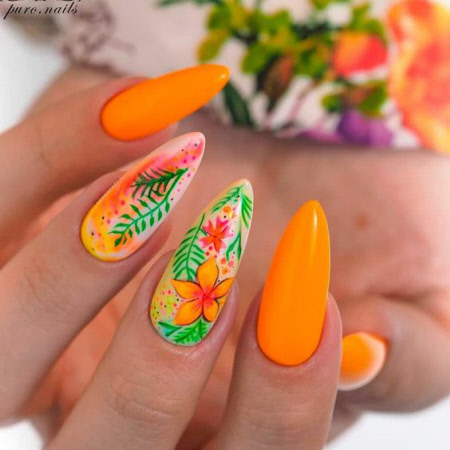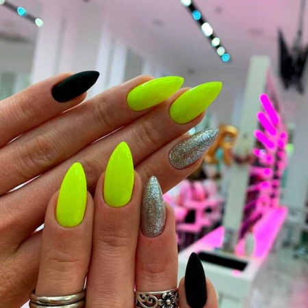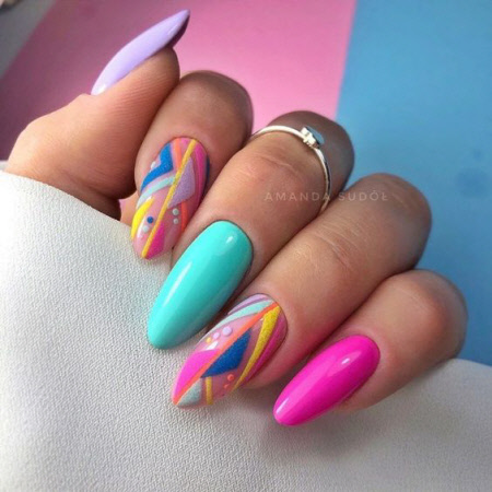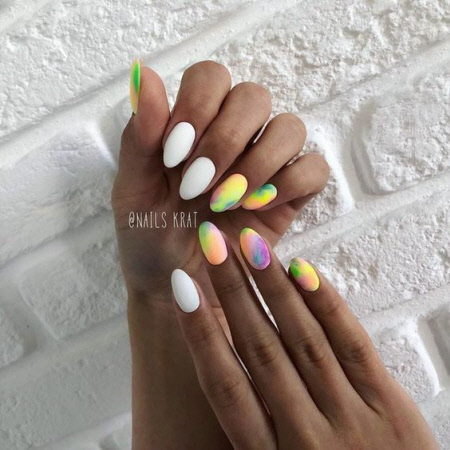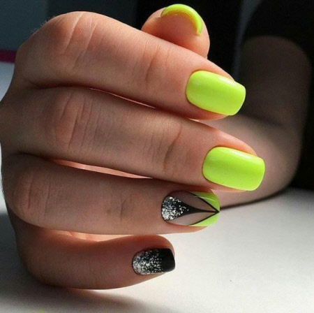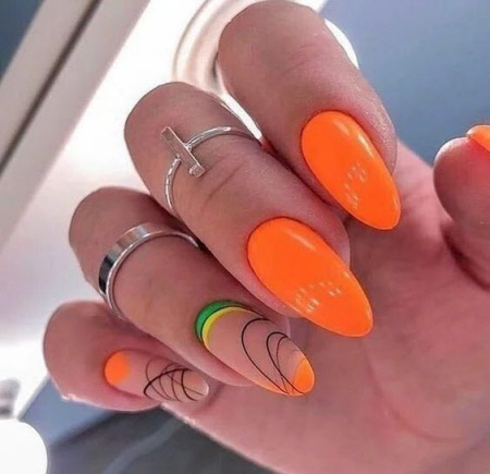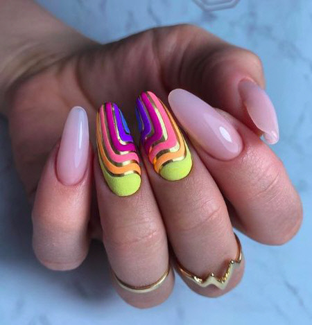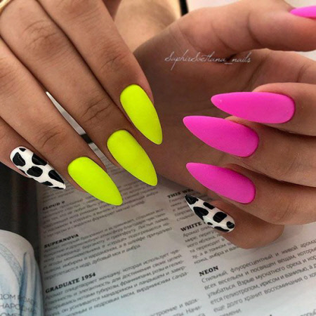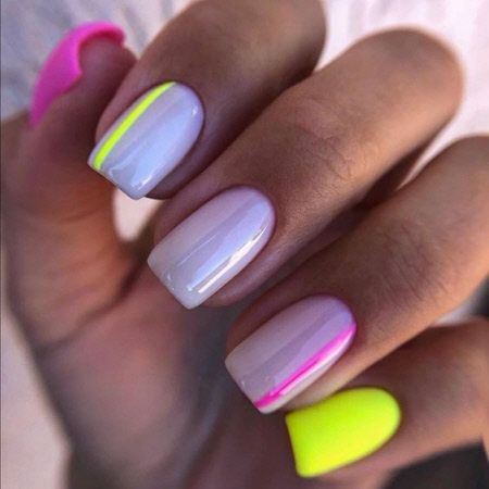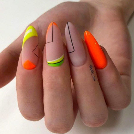 Sie können eine helle Maniküre mit einem Muster aus animalischen Blumendrucken, geometrischen Formen und regelmäßigen Linien, lakonischen Tupfen und unerwarteten Abstraktionselementen machen. Vergessen Sie auch nicht Glitzer, Kamifubuki, Folie und Kieselsteine, mit denen Sie die Neon-Maniküre stilvoll dekorieren können. Helle Neon-Maniküre in ethnischen und impressionistischen Themen sieht toll aus.