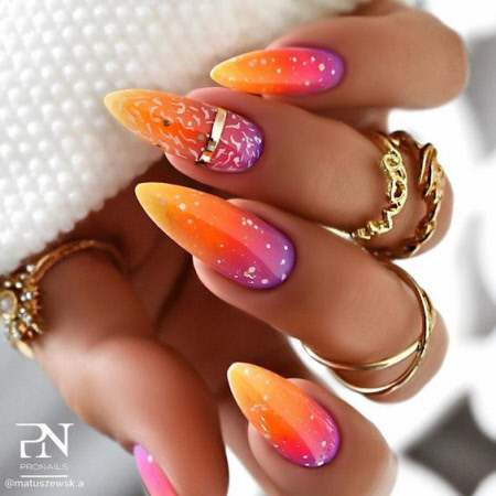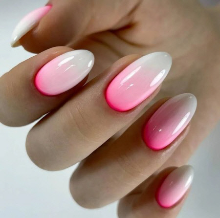 Ombre ist ein trendiges und helles Nageldesign für die Saison 2024-2025. Neonpoliturfarben sehen toll aus, wenn sie mit einem Ombre-Design kombiniert werden. Verwenden Sie für einen modischen Farbverlauf mehrere trendige Farbtöne der Saison gleichzeitig. Sehen Sie sich das Foto an, um interessante Ideen für kurze und lange Nägel zu erhalten:
