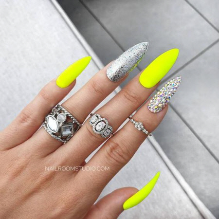 Helle Neon-Maniküre mit Glitzern und Strasssteinen