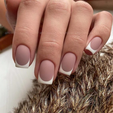 Eine matte Jacke sieht immer stilvoll und schick aus und ist unglaublich vielseitig, da sie jedes Outfit schmücken kann. Matte French Manicure eignet sich für jede Nagelform und -länge, siehe Foto für die besten Ideen von 2024: