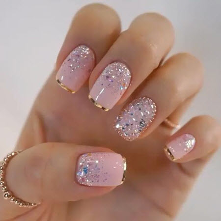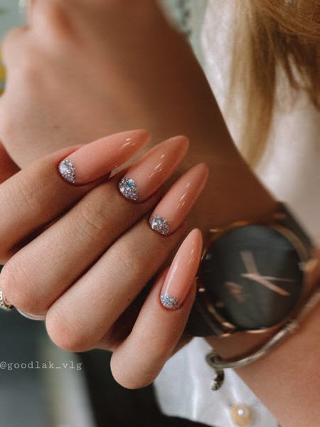 Pailletten werden auch 2024 in der Nailart ein Trend sein, und zarte Lacktöne werden sehr schön mit verschiedenen Glitzern kombiniert: flüssige kleine Glitzer, Glitzer, Kamifubuki.