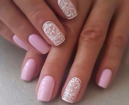 Feinste Spitzenmotive, Blumenarrangements, ausgefallene Smile-Formen, glänzende Streifen und der Glanz einer Kristallstreuung unterstreichen die Jacke und die Weiblichkeit Ihrer Hände zudem sehr schön. Die heikelsten Ideen, sehen Sie sich das Foto an: